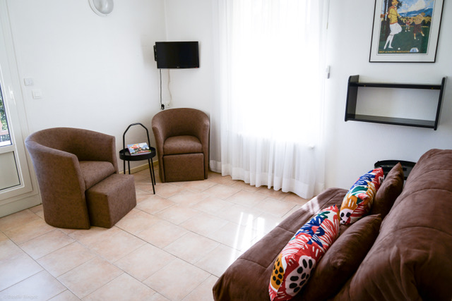 – Séjour Chambre (exposition sud + fenêtre à l’ouest) avec canapé-lit (BZ 140 cm) + 2 fauteuils, télévision, grand placard mural